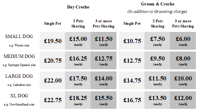 We will continue to offer our popular Day Board and Groom & Creche services, these will remain at the current rates and are as follows: