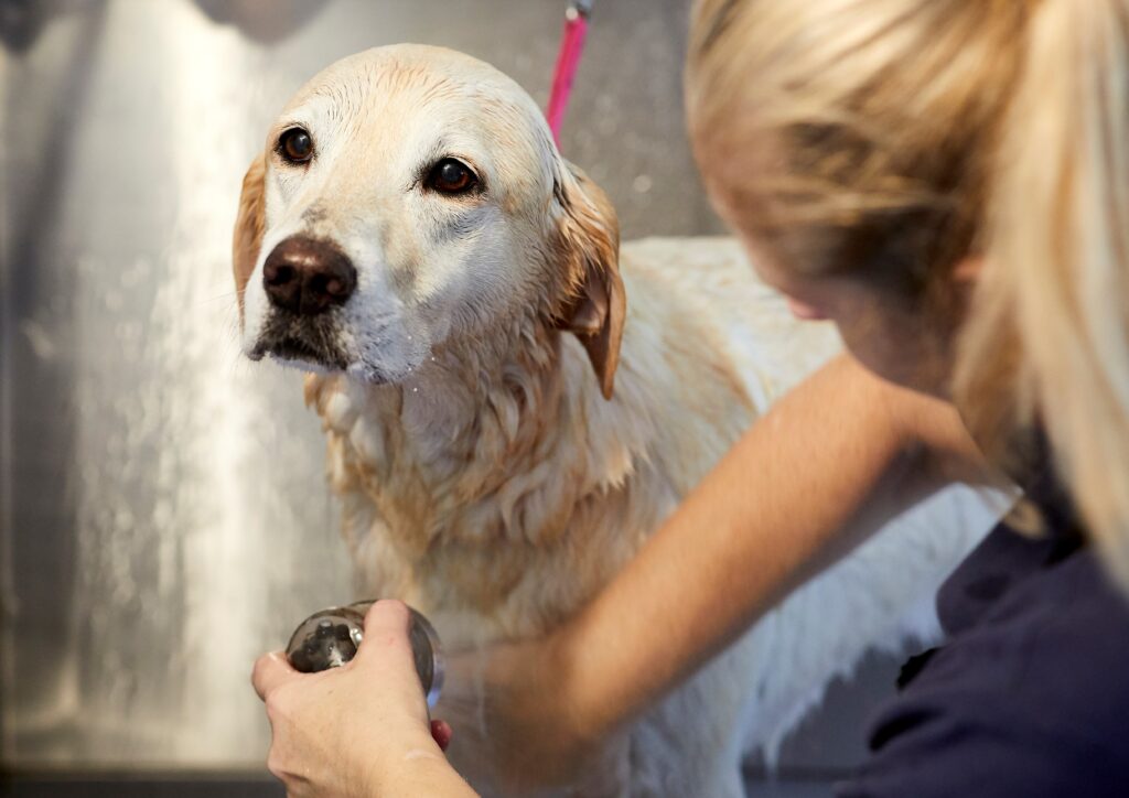 (Tracy, one of our dog grooming assistants, bathing Tilly)