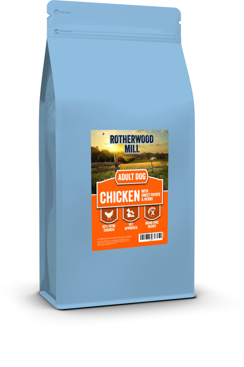 Chicken 55% (including Freshly Prepared Chicken 31%, Dried Chicken 21% & Chicken Stock 3%), Sweet Potato (26%), Peas (6%), Potato, Beet Pulp, Linseed, Omega 3 Supplement, Minerals, Vitamins, Vegetable Stock, Marjoram, Basil, Oregano, Sage, Thyme, Parsley, FOS (96 mg/kg), MOS (24 mg/kg)