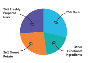 Duck 52% (Freshly Prepared Duck 26%, Dried Duck 24%, Duck Stock 2%), Sweet Potato (26%), Peas (8%), Potato, Omega 3 Supplement, Linseed, Beet Pulp, Minerals, Orange (0.3%), Cranberry, Fructooligosaccharides (FOS, 96 mg/kg), Mannanoligosaccharides (MOS, 24 mg/kg)
