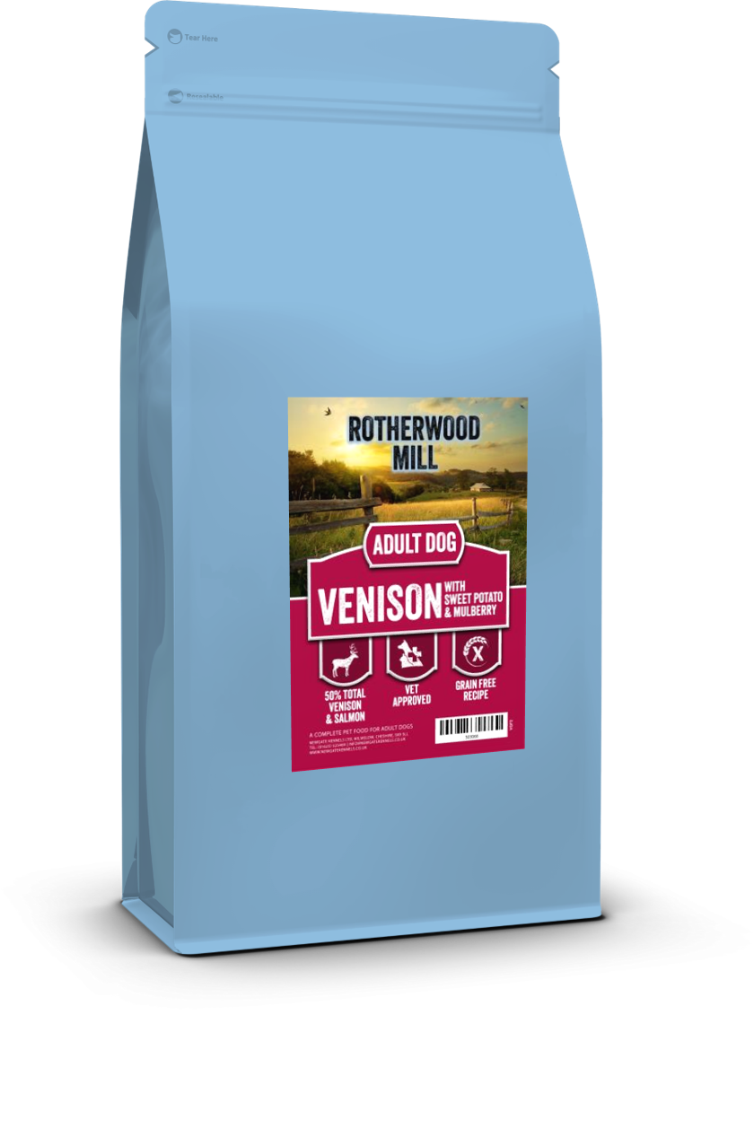 Venison & Salmon 50% (including Freshly Prepared Venison 26%, Dried Salmon 19% Salmon Oil 2.5% & Salmon Stock 2.5%), Sweet Potato (27%), Potato, Peas (6%), Omega 3 Supplement, Linseed, Beet Pulp, Minerals, Vitamins, Vegetable Stock, Mulberry (0.2%), FOS (96 mg/kg), MOS (24 mg/kg)