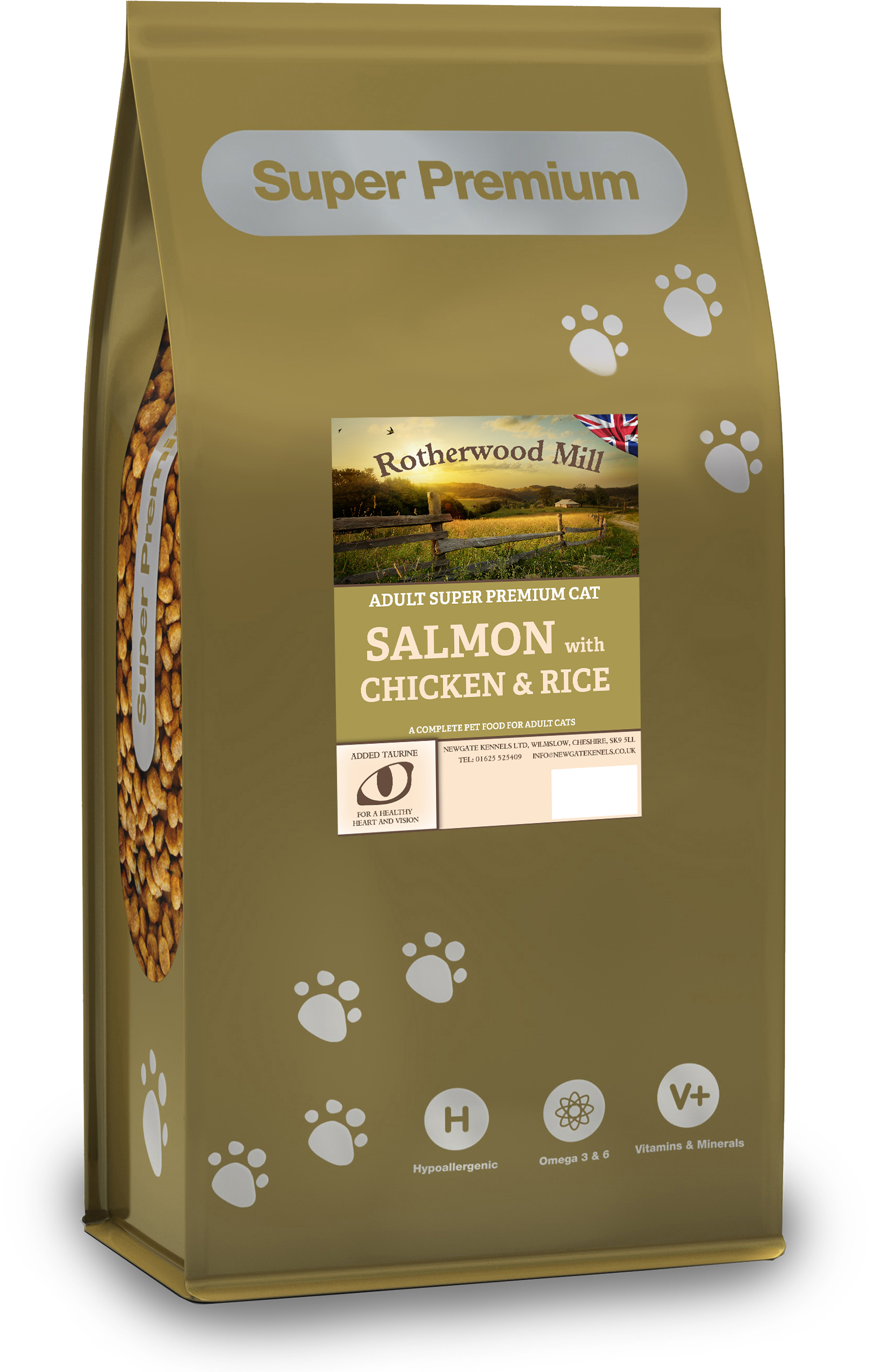 60% Fish and Chicken (Including Freshly Prepared Salmon 26%, Dried Chicken 22%, Chicken Fat 8%, Salmon Oil 2%, Fish Gravy 2%), Maize, Rice (12%), Beet Pulp (4%), Dried Egg, Brewer’s Yeast, Minerals, Vitamins, Cellulose (0.5%), Salt, Fructooligosaccharides (480 mg/kg), Mannanoligosaccharides (120 mg/kg)