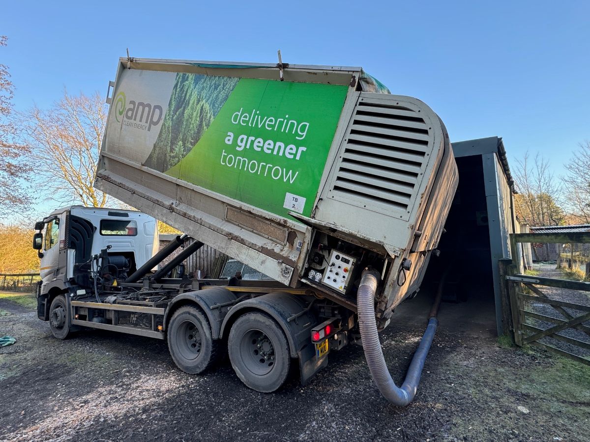 Woodchip is delivered every 10 days and blown into our storage shed