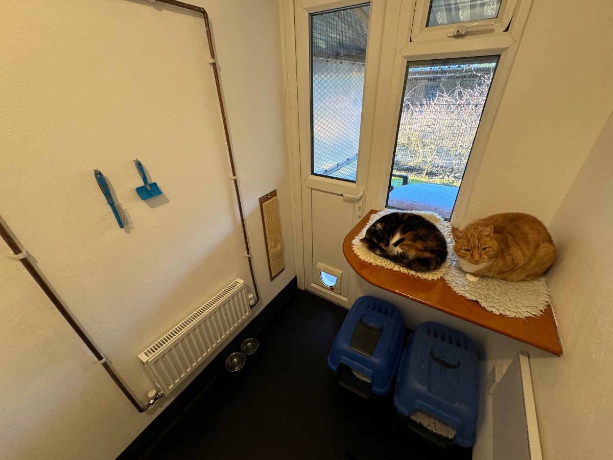 Millie and Rodney, warm and settled in their cat chalet.